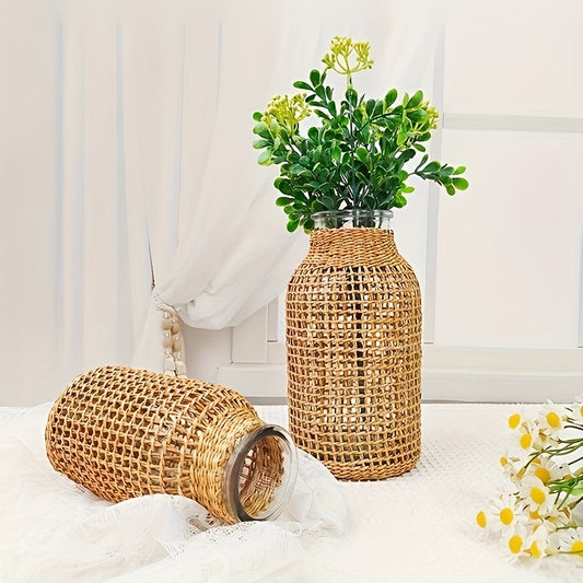 Jarrón de Cristal con Cubierta de Ratán – Estilo Boho para Ramilletes o Decoración de Mes