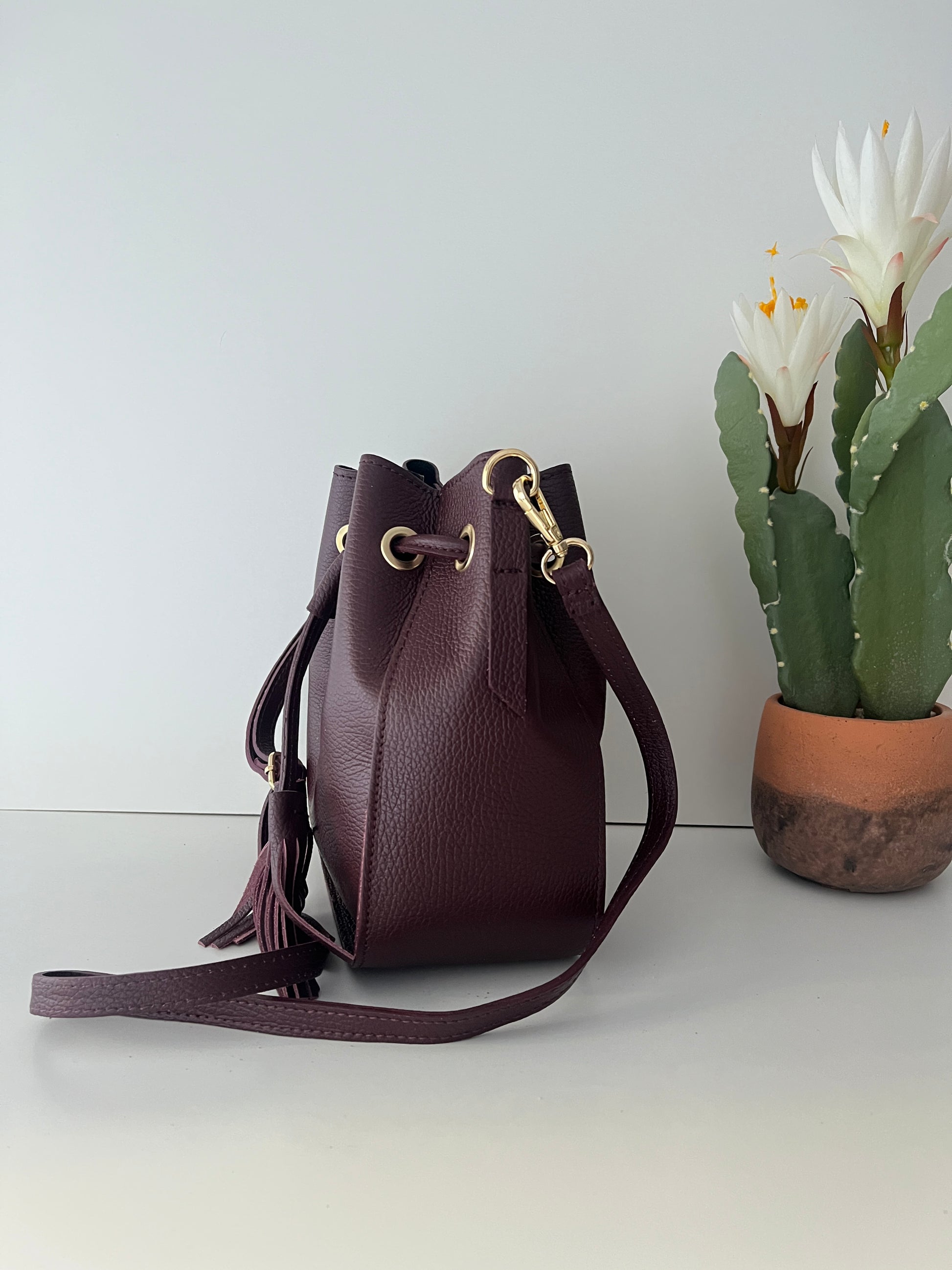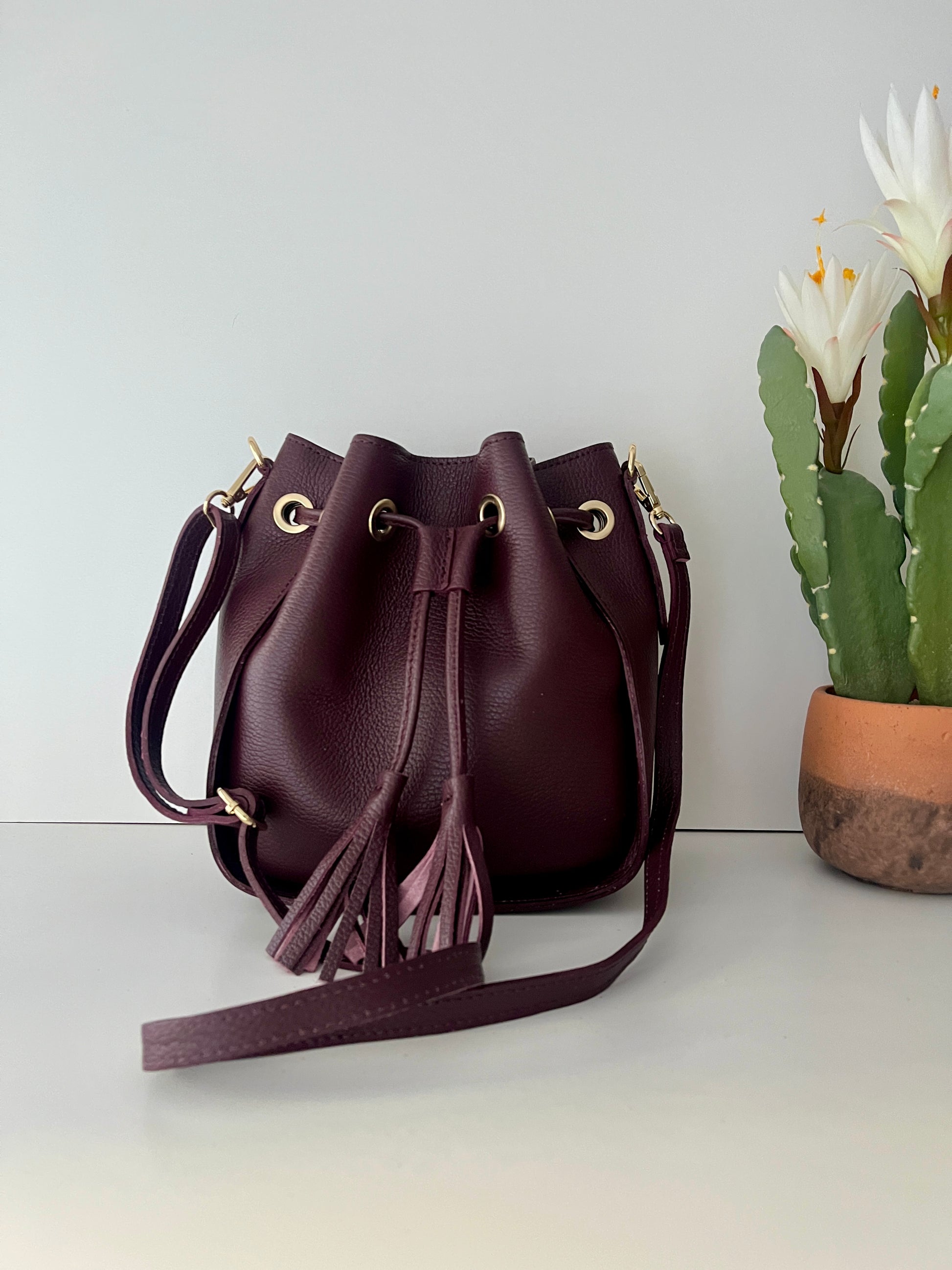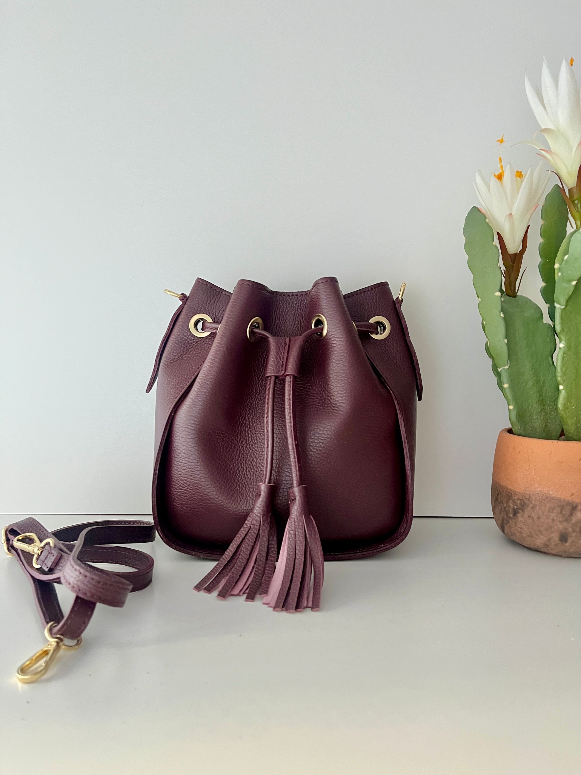 Bolso confeccionado en piel en forma de bombonera, cierre a lazo y con iman, interior forrado, bolsillo en el interior, asa de bandolera en pie ajustable.