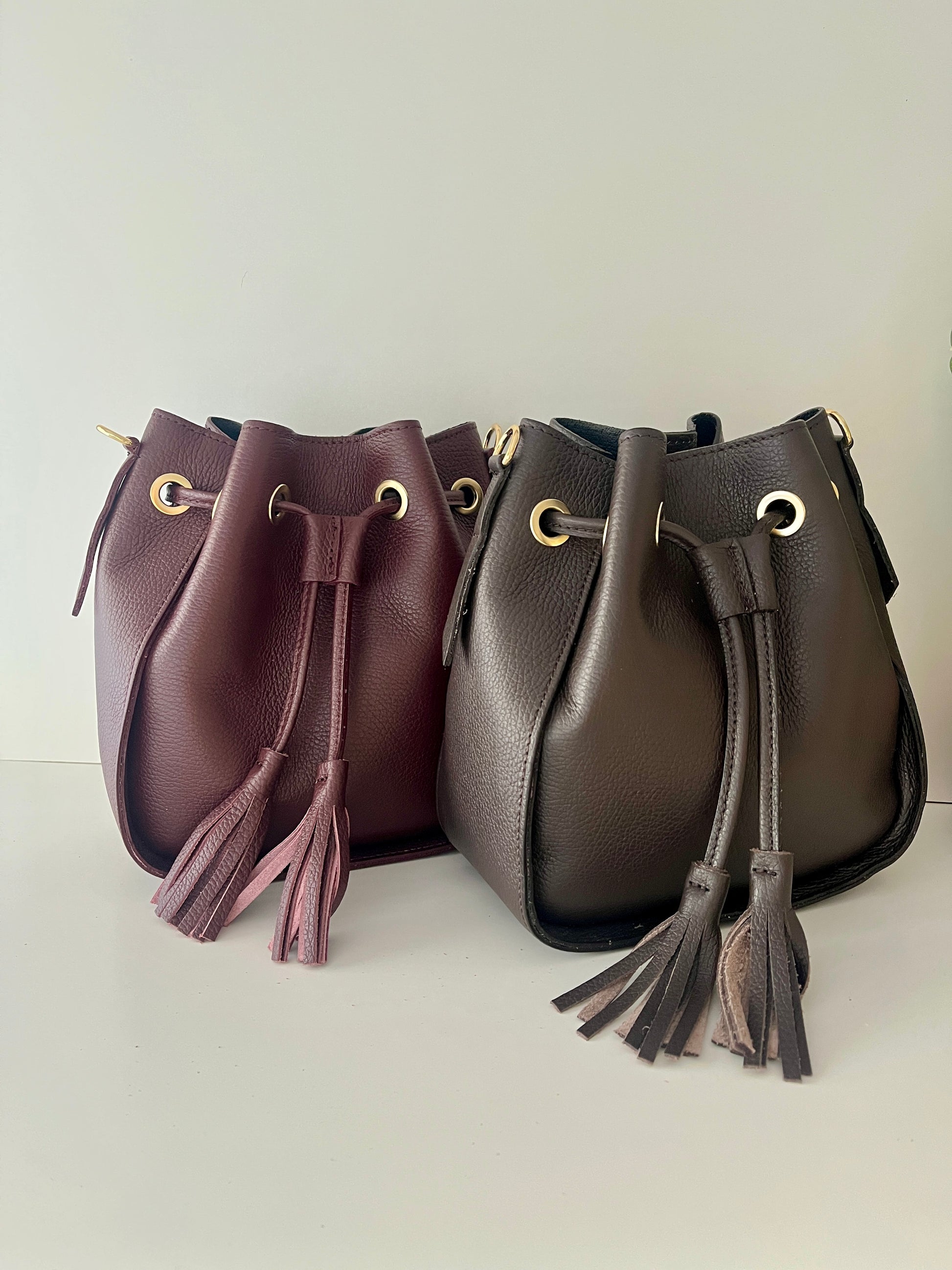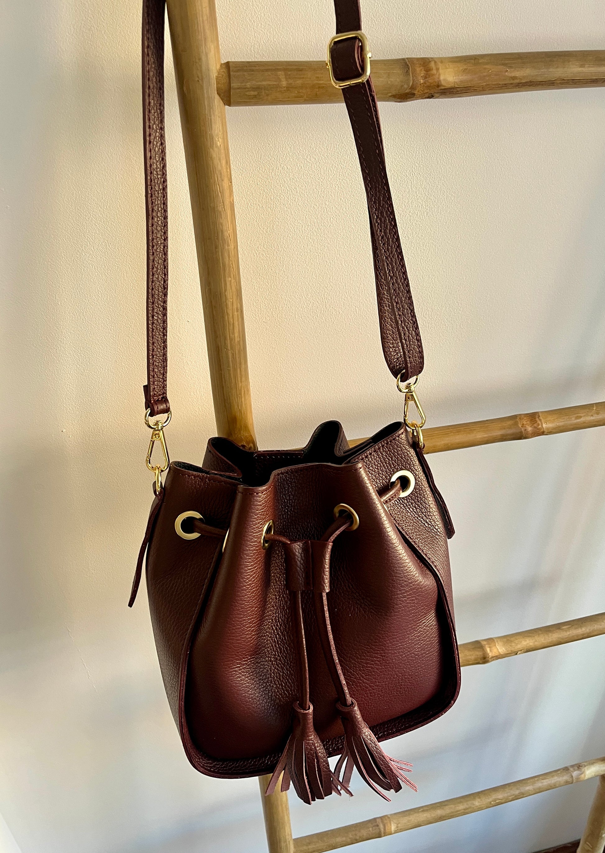 Bolso en piel color marrón, con asa corta de mano y asa larga de cadena, cierra con lazo corredero.