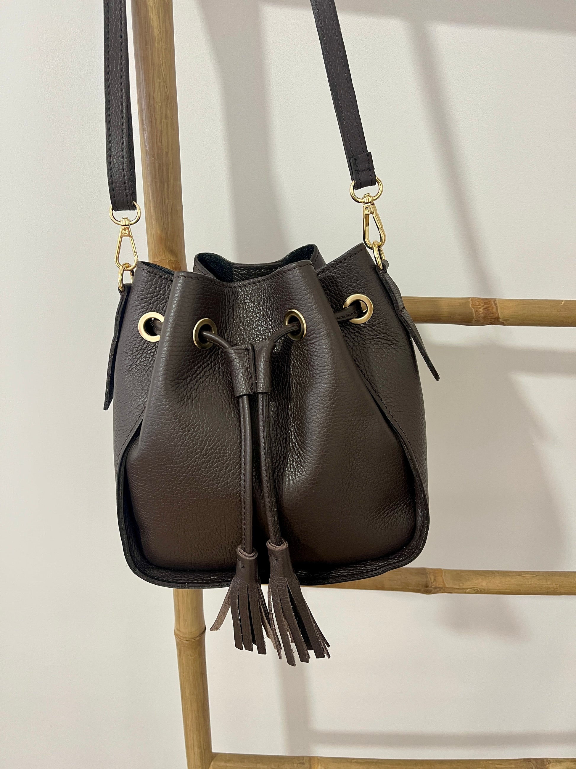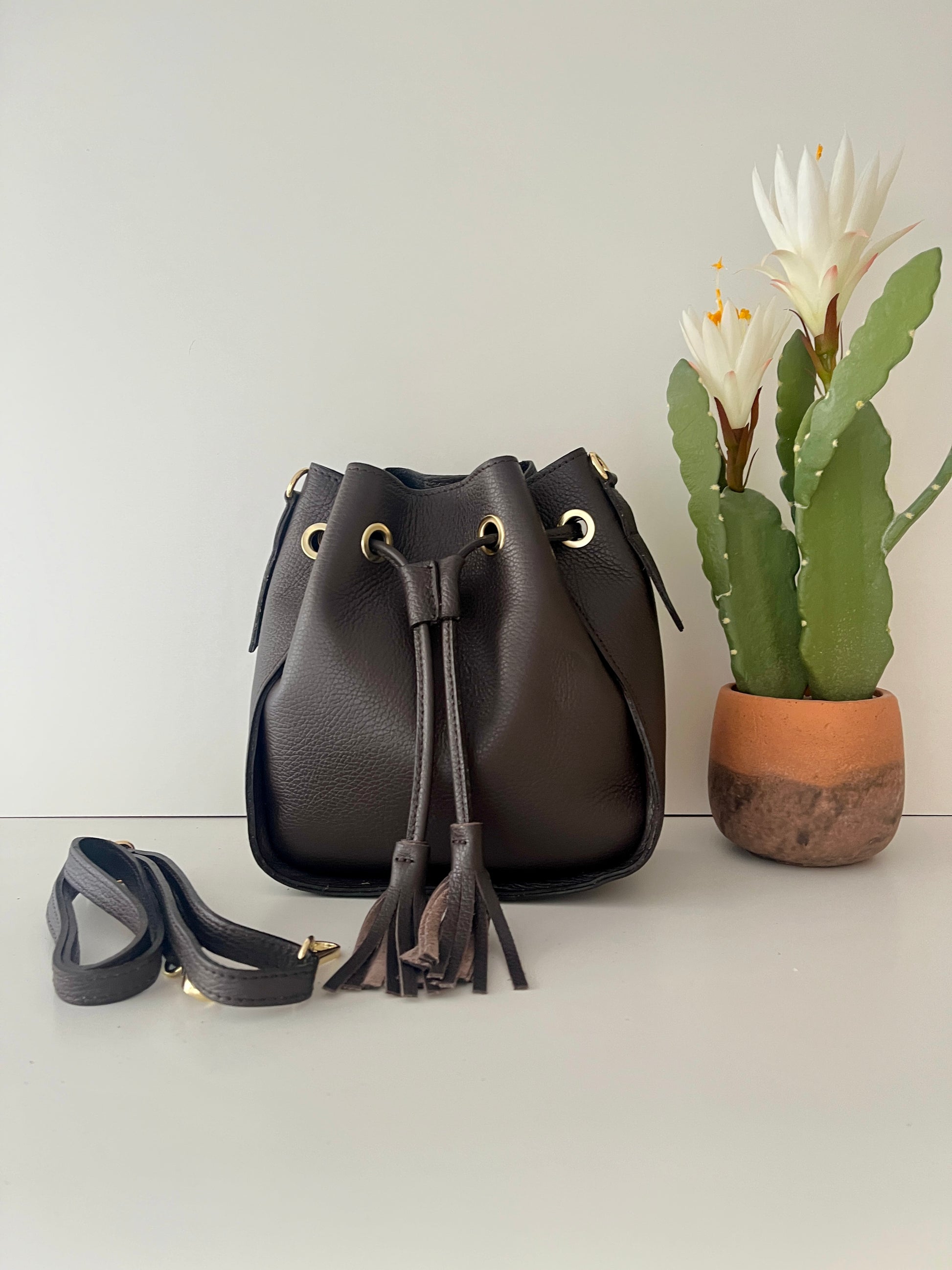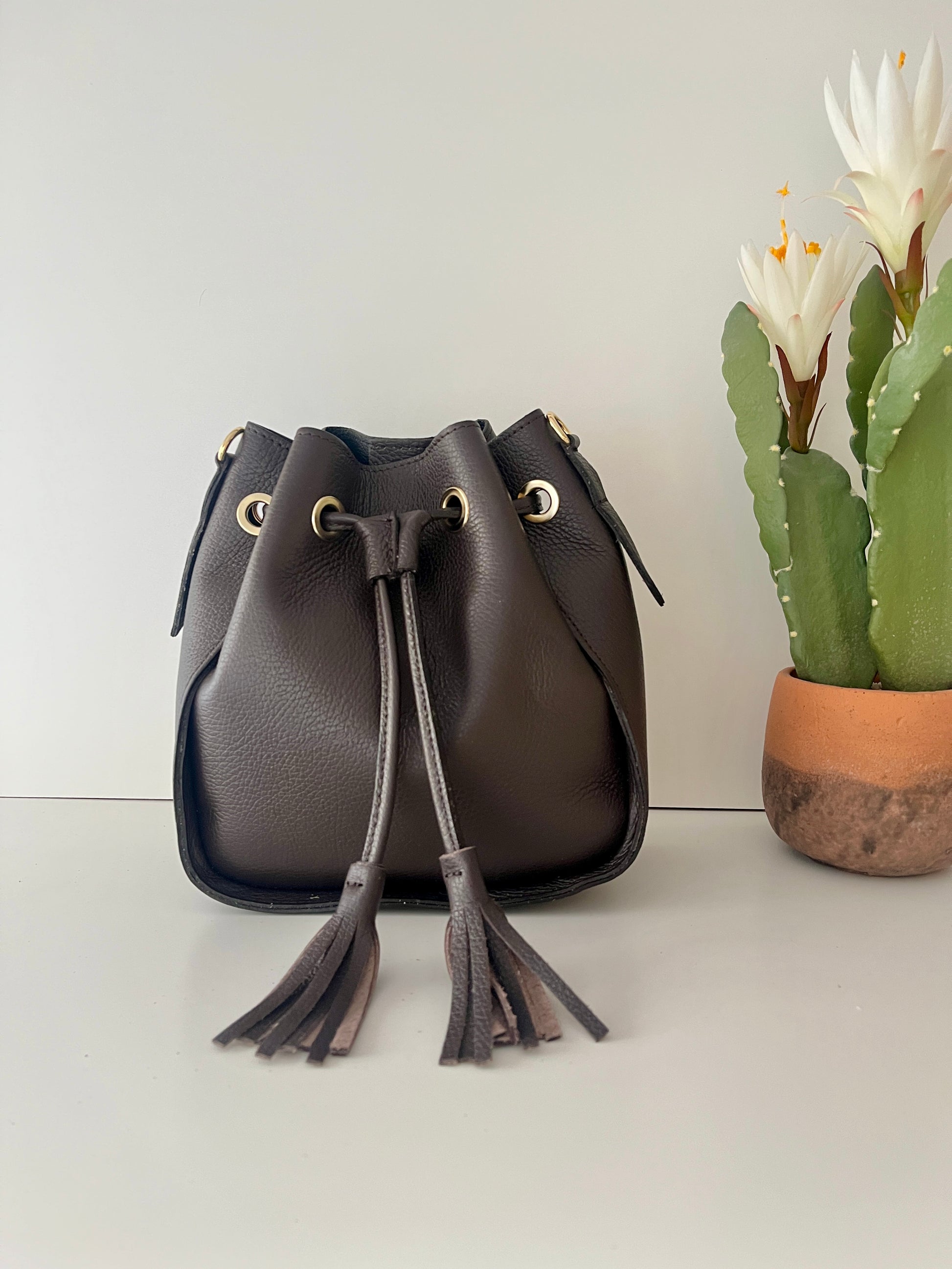 Bombonera Piel Cuadrada Borla - Marrón Chocolate