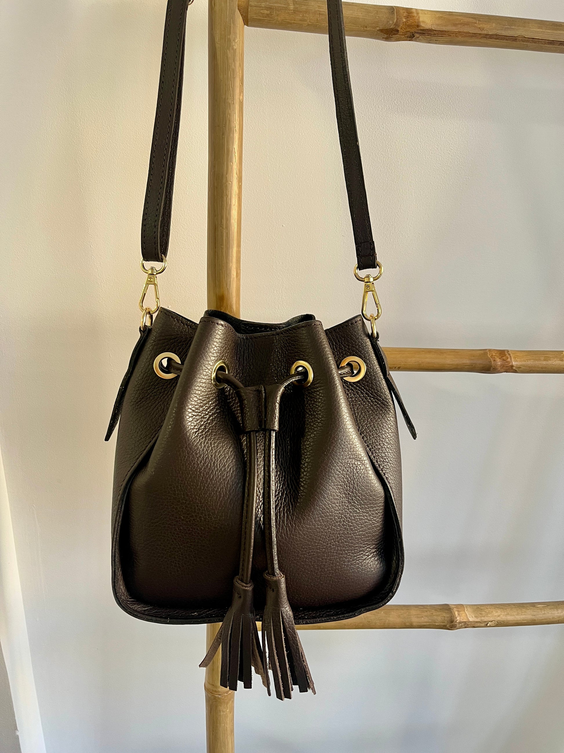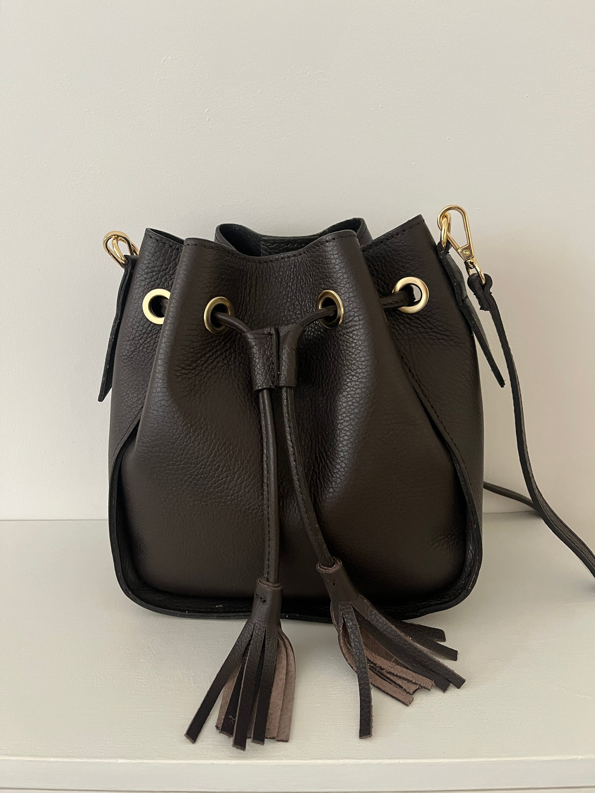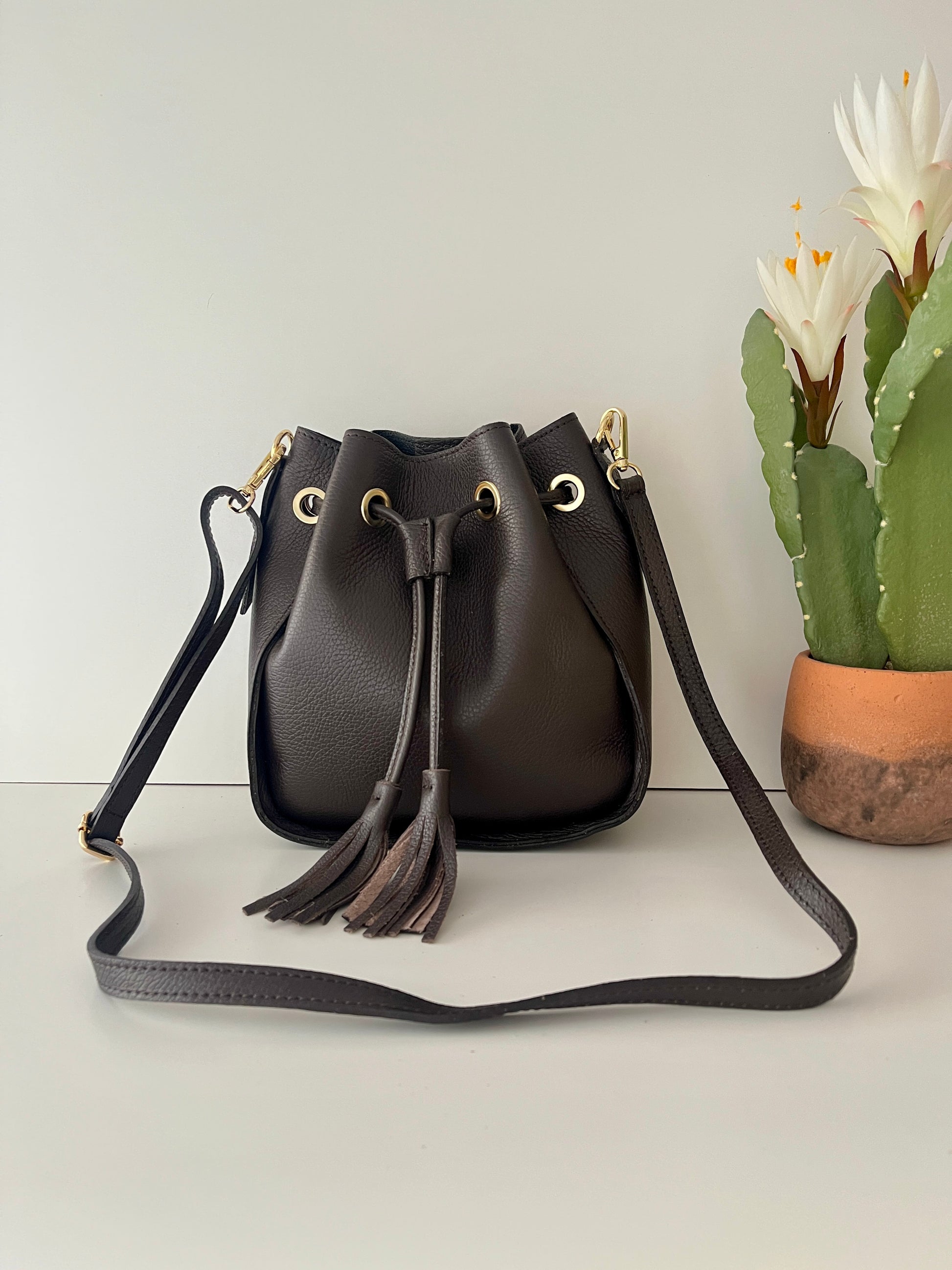 Bombonera Piel Cuadrada Borla - Marrón Chocolate